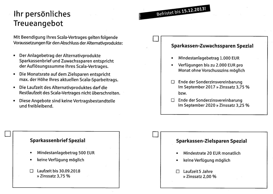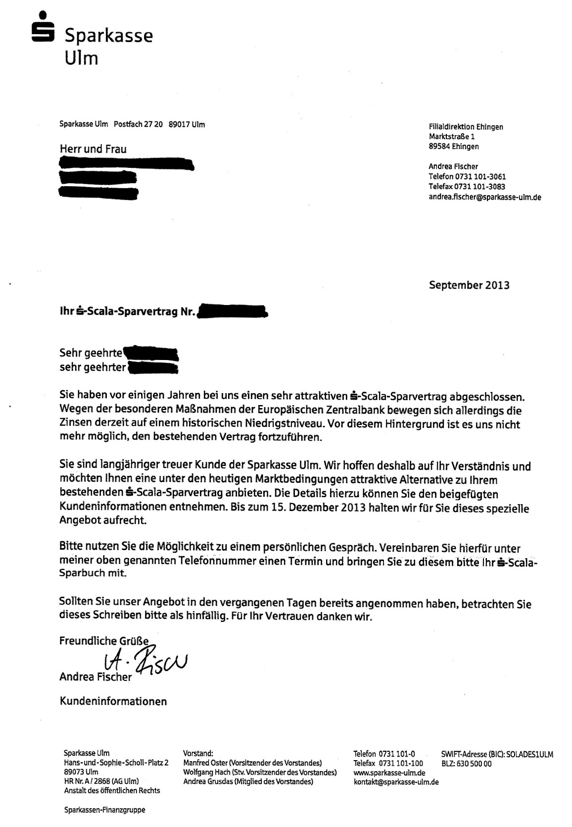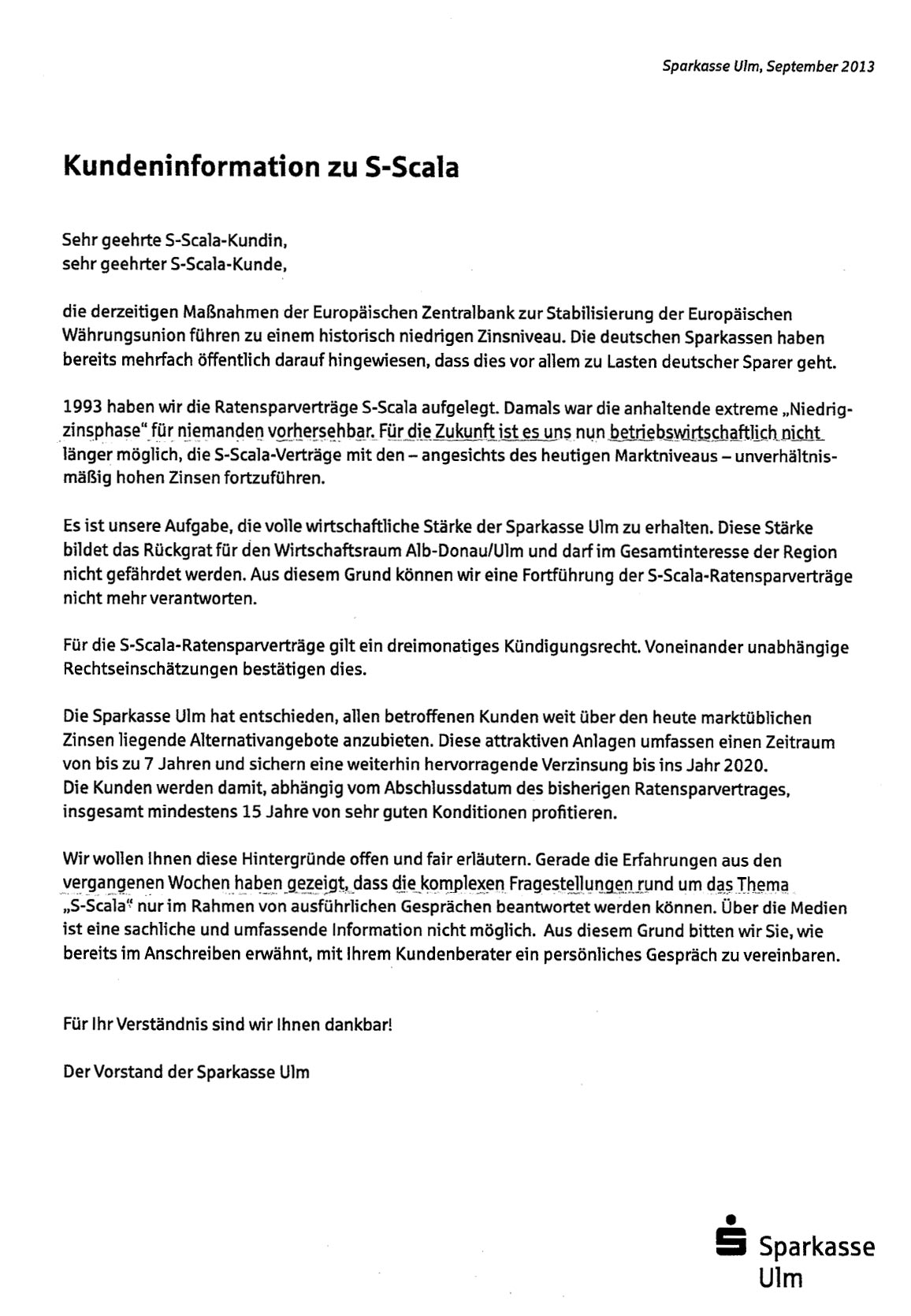 Unter dem Datum „September 2013“ versendet die Sparkasse Ulm derzeit ein Rundschreiben an alle diejenigen Scala-Kontoinhaber, die die von der Sparkasse angebotenen Alternativ-Sparverträge bislang nicht angenommen haben. Die Annahme dieser Alternativ-Sparverträge war von der Sparkasse zunächst bis zum 30.09.2013 befristet.