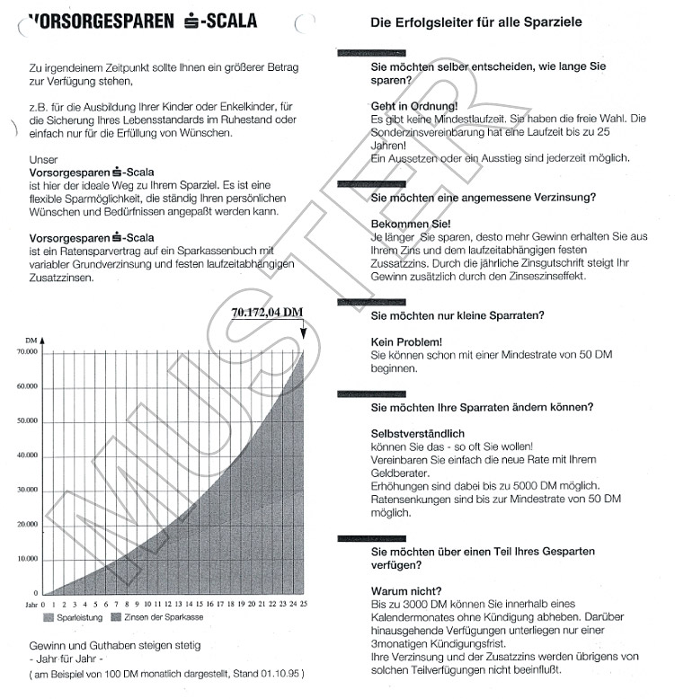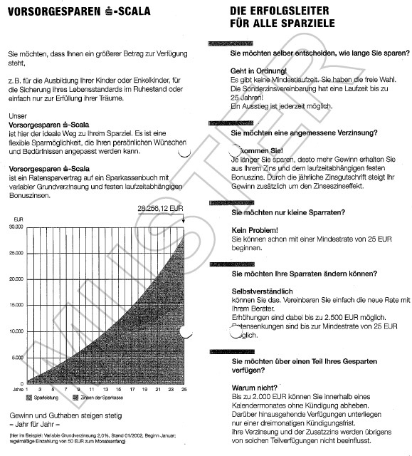 Nach den von der Sparkasse in ihrer Klageerwiderung vorgebrachten Argumenten zeichnet sich ab, dass zentraler Streitpunkt des Rechtsstreits die Beurteilung eines Werbeflyer sein wird, den die Sparkasse in den Jahren ab Anfang/Mitte der 1990er Jahre bis ins Jahr 2005 in großer Zahl verteilte. Der Flyer wurde von Zeit zu Zeit geringfügig modifiziert. Zwei Versionen des Flyers werden nachfolgend eingeblendet: